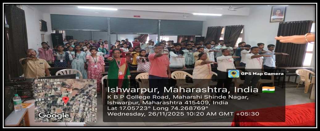 संविधान दिनाच्या निमित्ताने संविधानाच्या पालनाची शपथ घेताना प्राध्यापक, प्रशासकीय कर्मचारी आणि विद्यार्थी |